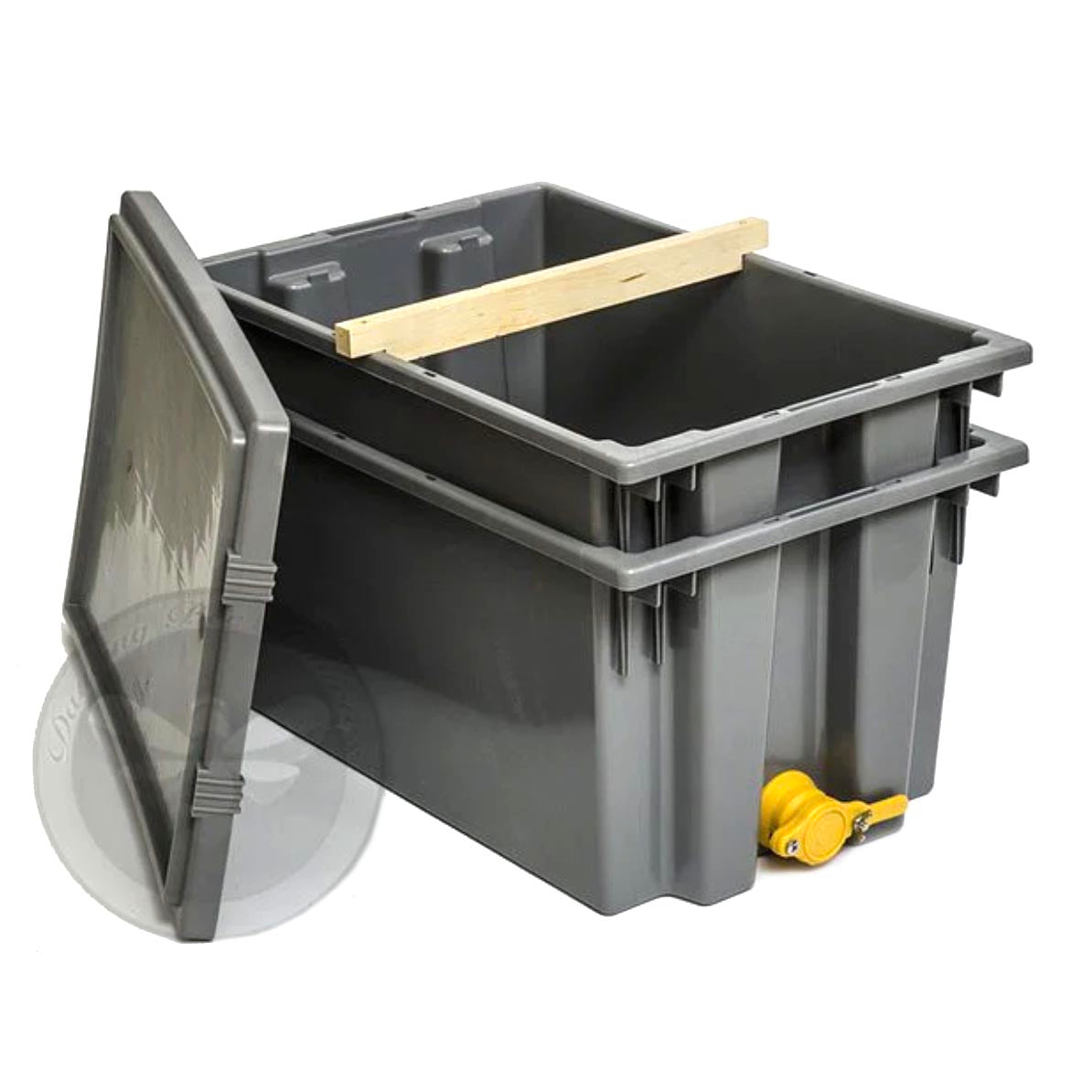 This is a remarkable multi-purpose Uncapping and Straining Tank! Made of high-density polyurethane, this Uncapping Tank stores up to 10 deep or medium frames for uncapping with a convenient lid for storage. Featuring a metal grid that fits in the bottom to strain cappings. This dual unit stacks one way for uncapping and reversed 180 degrees it becomes a strainer tank holding 6 gallons. It comes complete with a high-quality plastic honey gate!