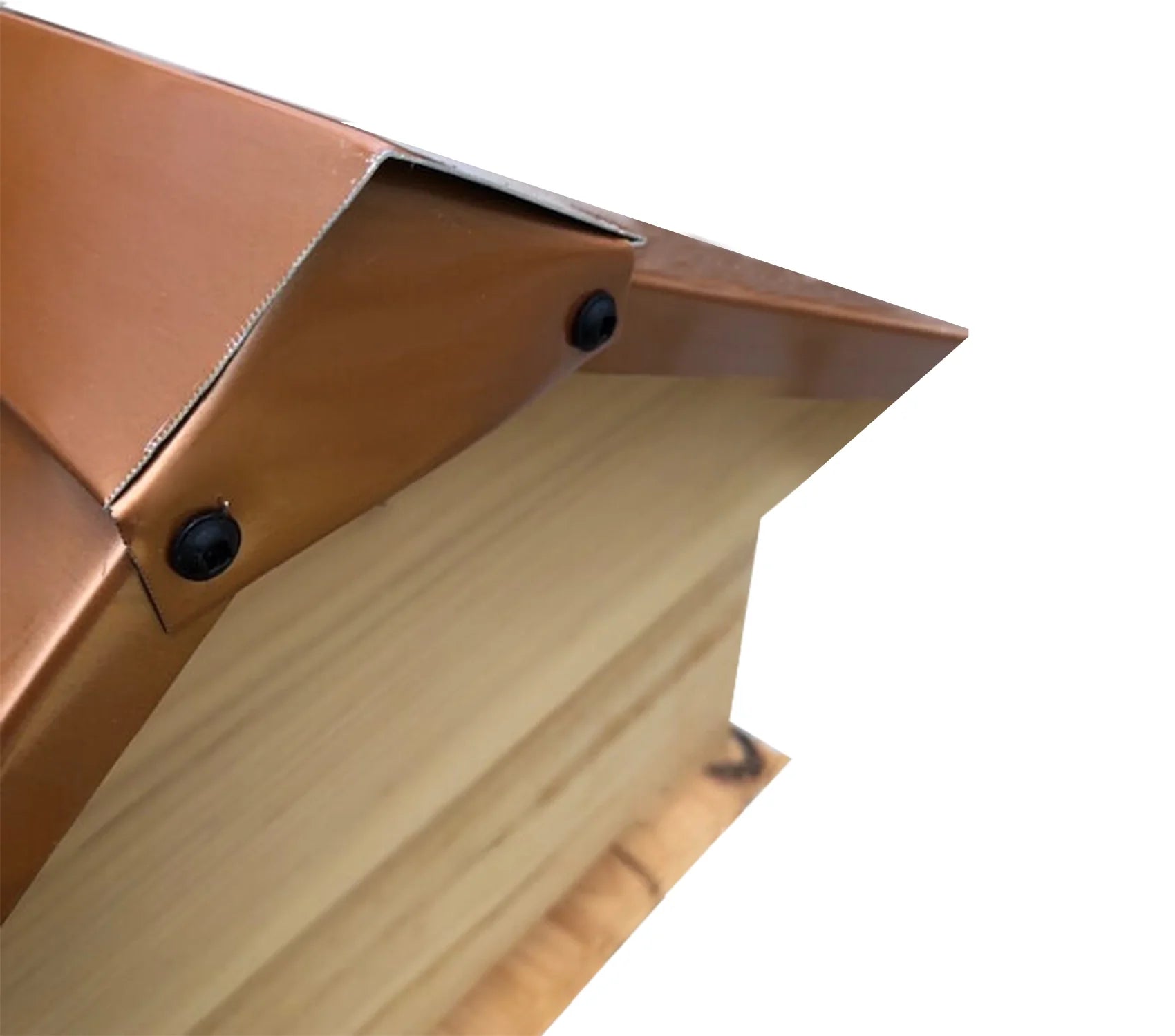The roof is covered with copper-colored aluminum. The Smart Hive looks beautiful and will keep your bees dry for years to come!