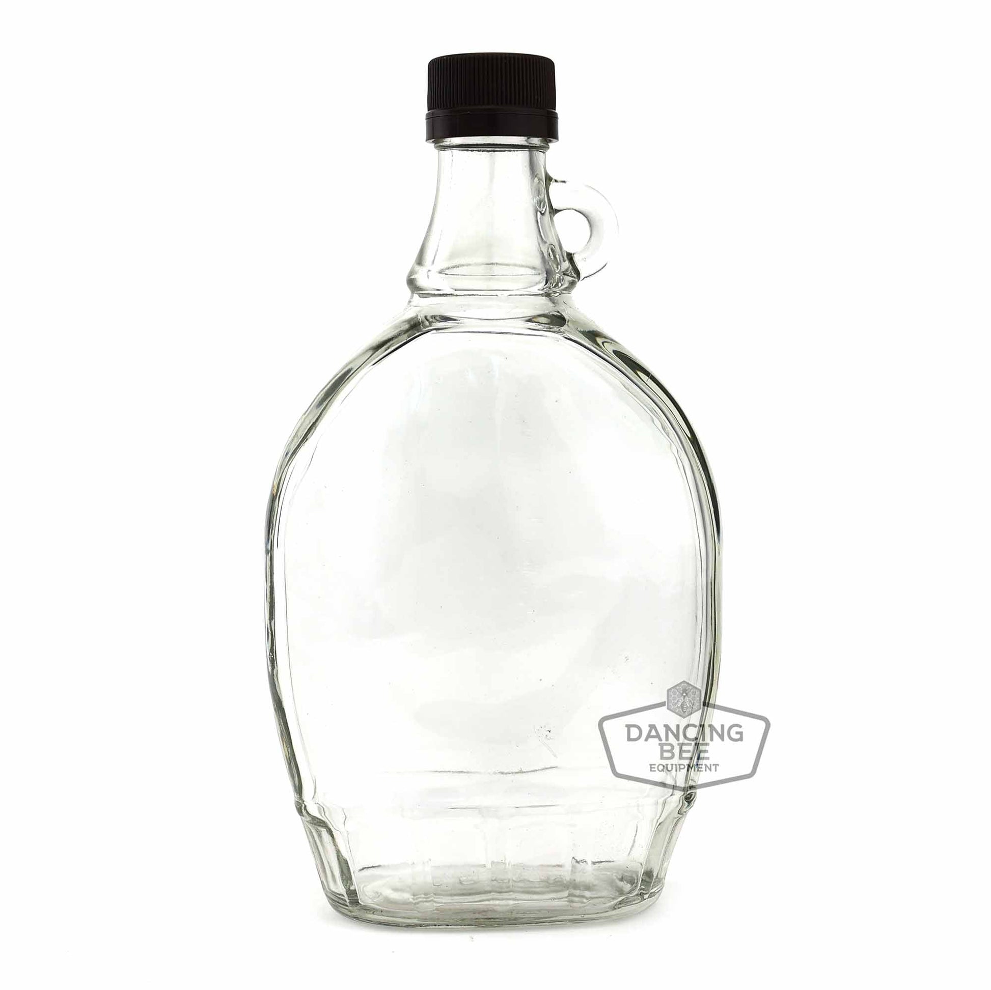Traditional style glass maple syrup bottle with finger hook. Also perfect for homemade sauces and herb-infused oils.