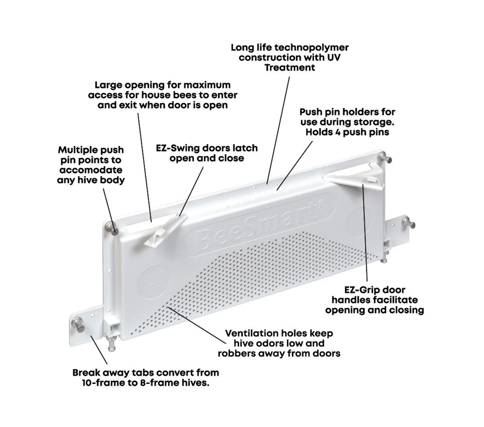 Multiple Bottom Board Options: Fits conventional bottom boards and the Ultimate IPM Bottom Board. Included pins can adapt to the BeeSmart® IPM Bottom Board or serve as a bottom vent on conventional bottom boards.